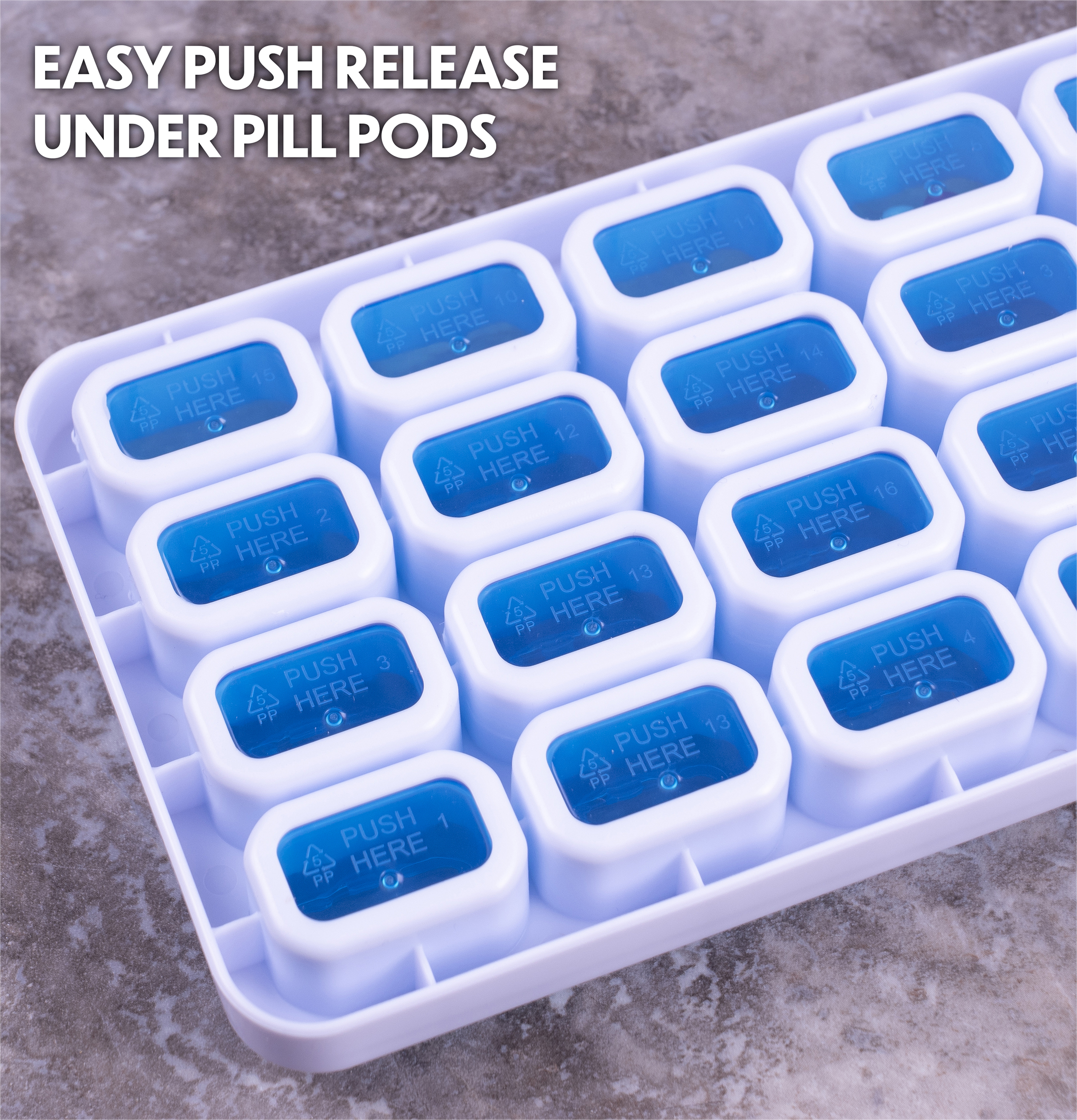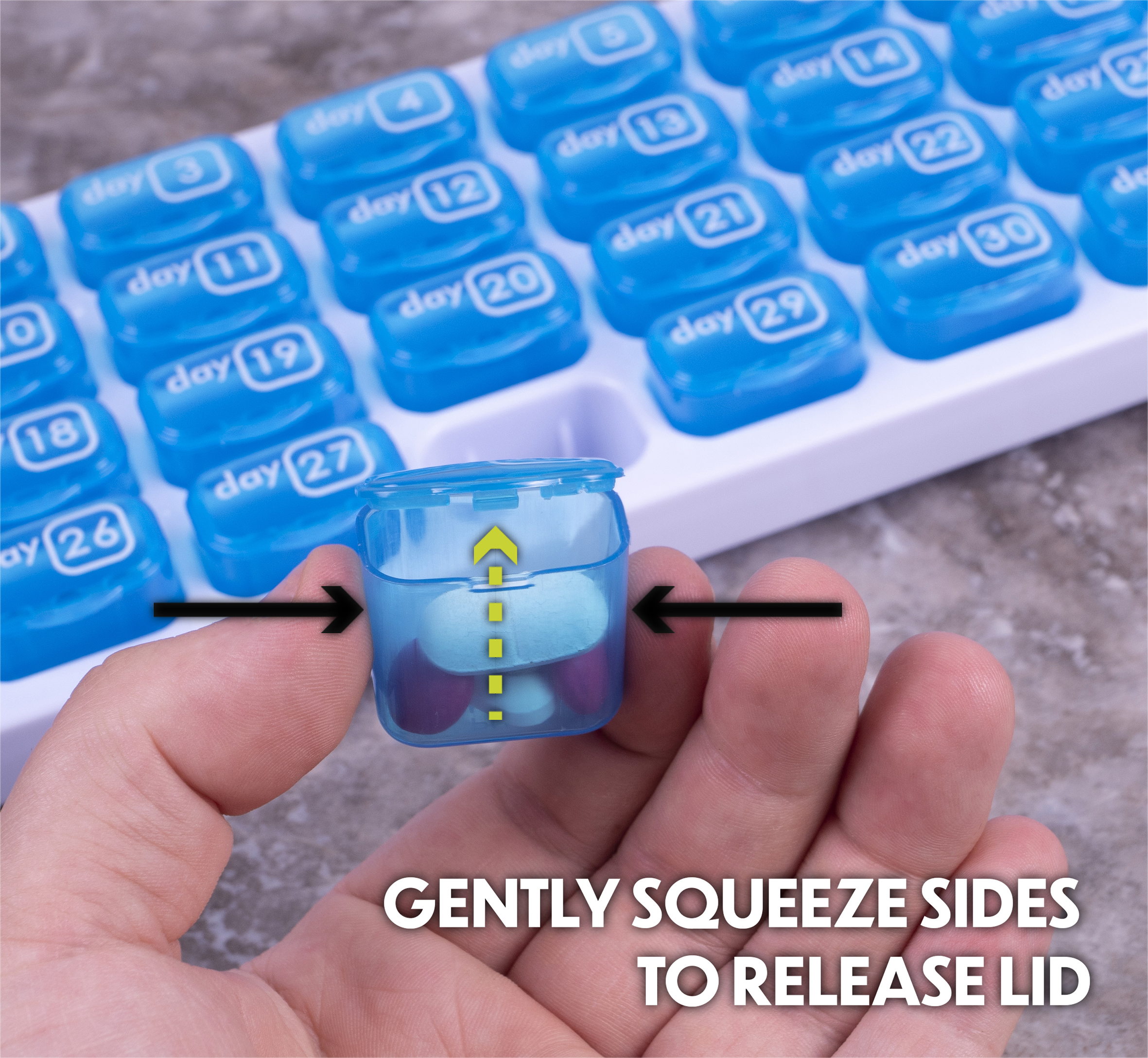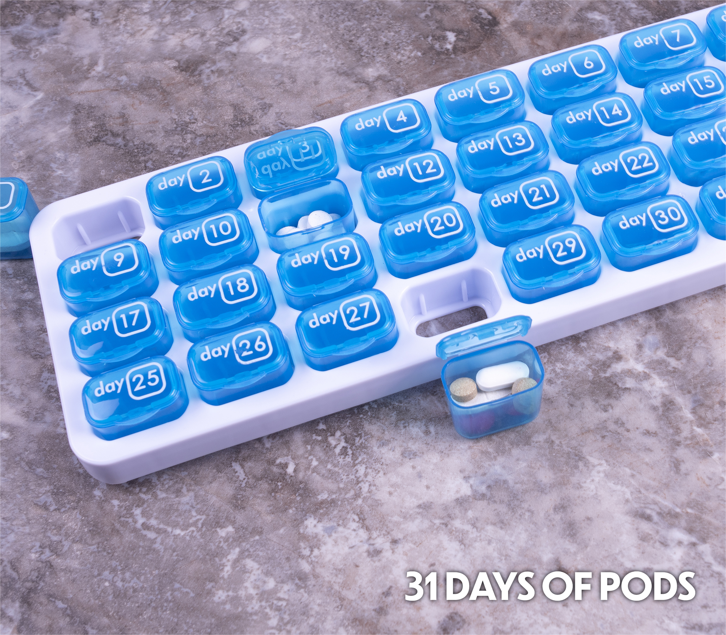 This medication storage holder has 31 seperate, removable compartments to store multiple tablets and pills. You can easily plan medication intake for yourself or a relative. The easy to use, removable pods are perfect for taking medication with you on a day out or weekend away. Lids snap shut to prevent spillage in transit. Each compartment is large enough to hold 5-7 pills for those who take multiple tablets. Organise an entire months medication in one, neat and practical container. BPA free.