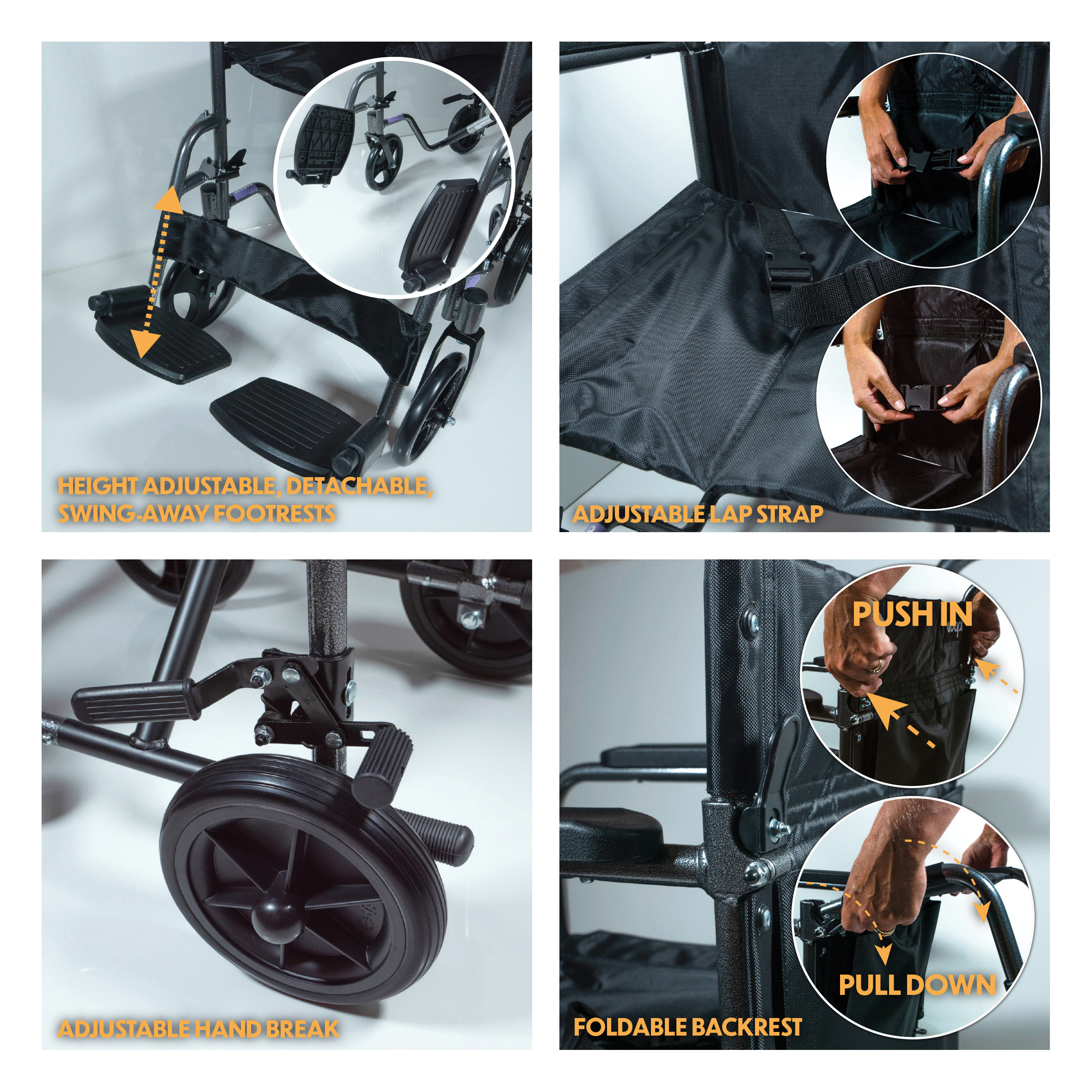 - Detachable, adjustable swing away footrests