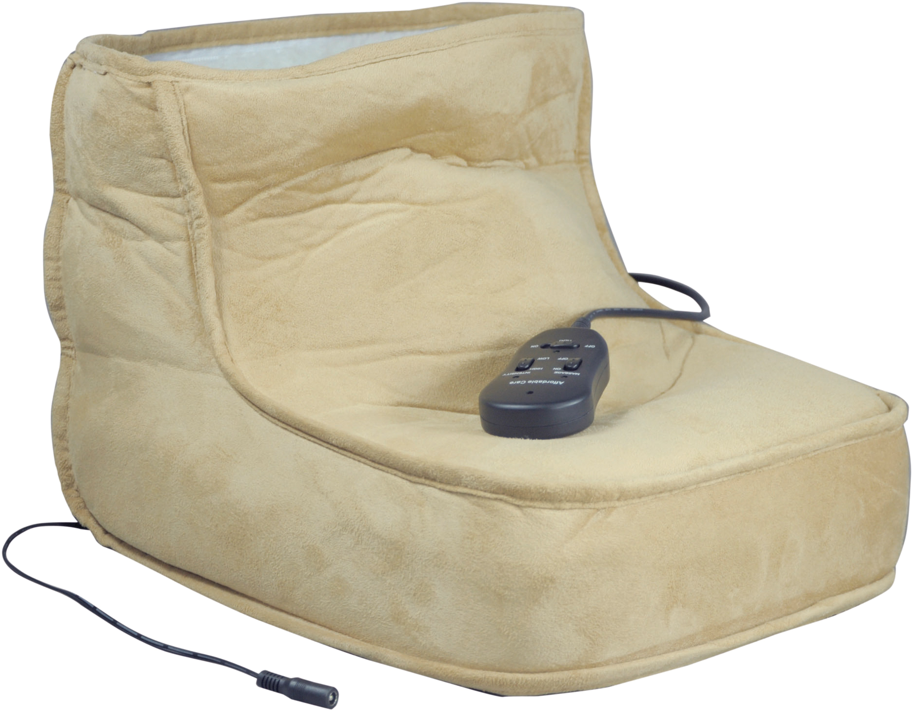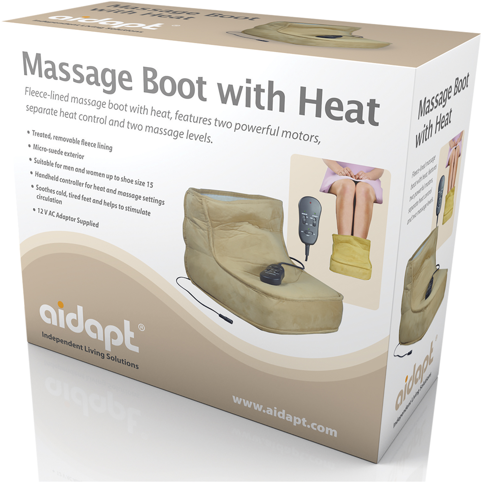 The fleece-lined massage boot with heat features two powerful motors, separate heat control and two massage levels. The Massage Foot Warmer has a soft, removable fleece lining that is machine washable and is treated to prevent lingering foot odour. The exterior material is a soft-touch micro-suede and the boot will fit up to a man s size 15 foot. The handheld controller adjusts both heat and massage; soothing cold, tired or aching feet.