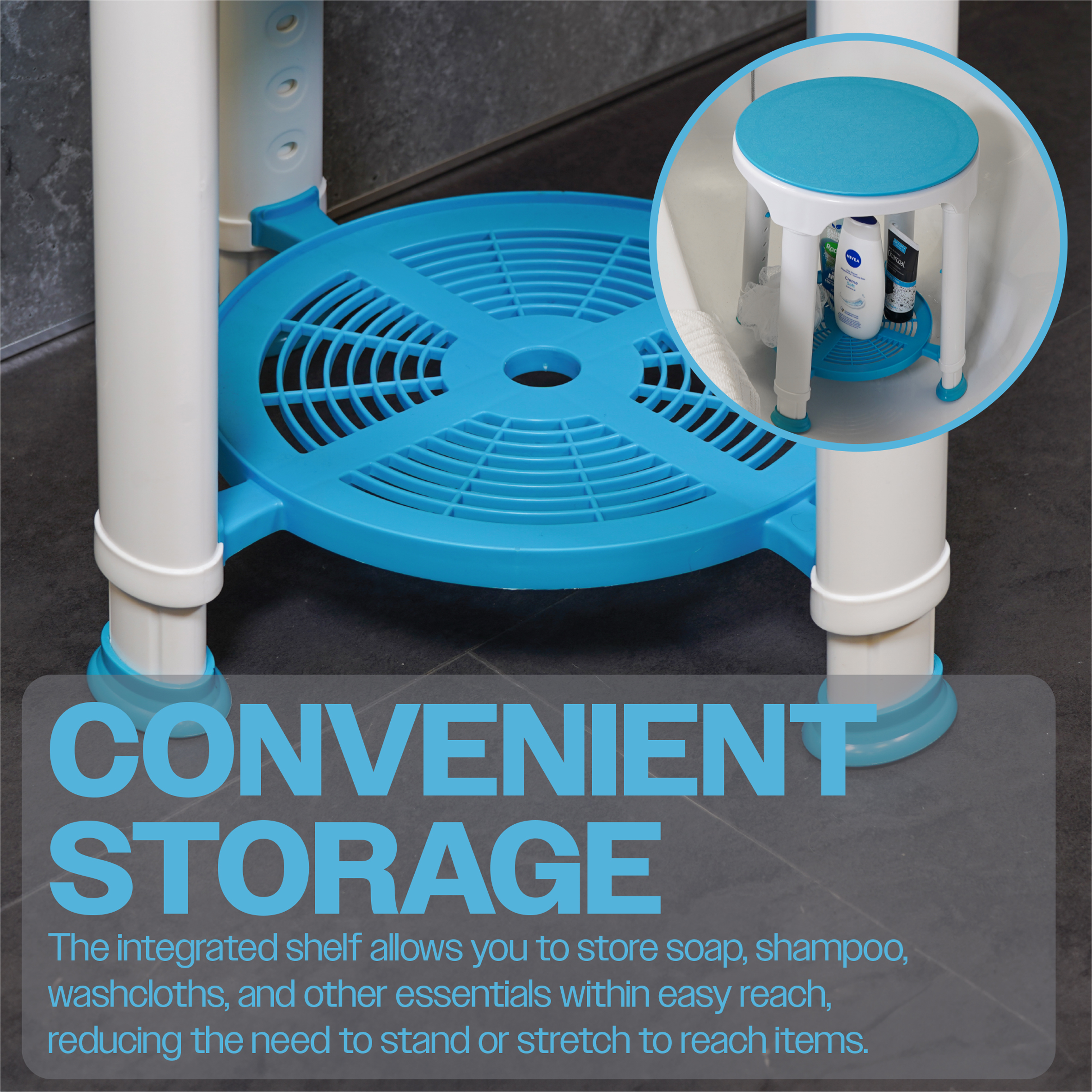 Round shower stool with rotating seat and removable shelf for storing shower products. Easy to assemble with no tools required.