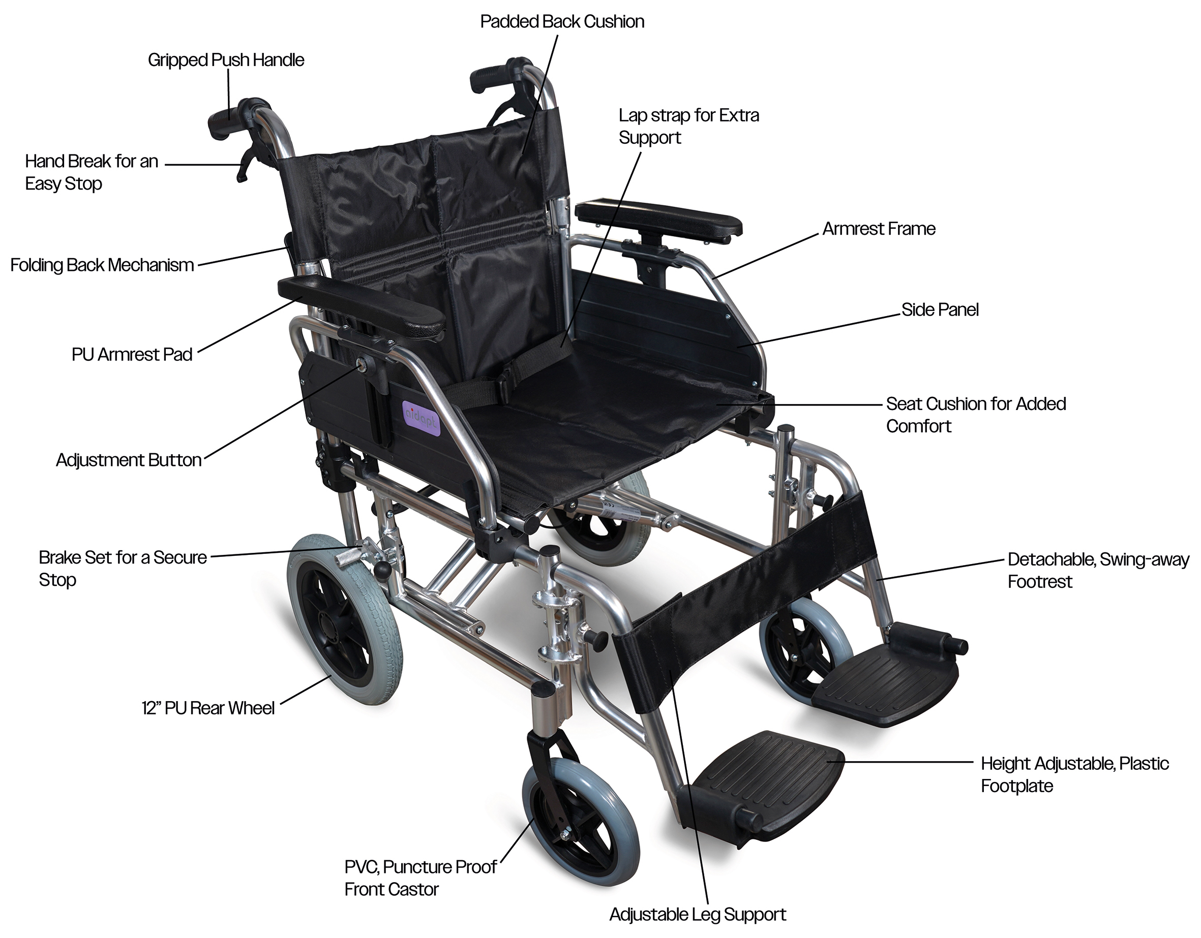 The York Attendant Propelled Transit Chair features a durable powder-coated frame and flip-up armrests, designed to facilitate easy side transfers. It is equipped with a deluxe padded nylon seat for added comfort, along with detachable footrests for convenience. The chair is fitted with 200mm PVC castors and 290mm rear wheels for smooth mobility. Supporting a maximum user weight of 150kg (23 stones), this reliable transit chair combines practicality with comfort for everyday use.