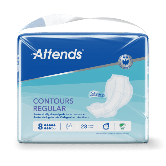 The Attends Contours Regular 8 incontinence pad is specially designed with an anatomical shape to provide optimal comfort and secure protection for individuals managing heavy urinary and/or fecal incontinence. Made to mold closely to the body’s natural contours, it offers dependable leak prevention and maximum comfort. The built-in wetness indicator helps you easily identify when it’s time to change the pad.