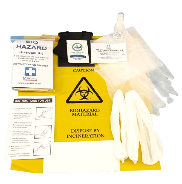 - Clothing: Polythene Oversleeves, Aprons, Disposable Gloves, Bio-Hazard Bag, Plastic Scoop and Scrape. Wipes: Non-woven wipes and an antiseptic wipe