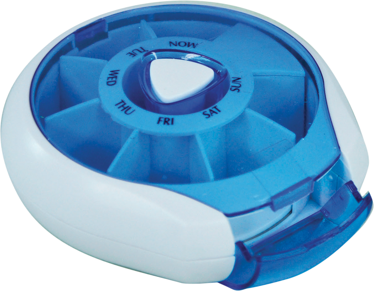 The handy, compact Weekday Pill Dispenser provides a simple reminder to take your medication, with one clearly-labelled compartment per day. The round Weekday Pill Dispenser has a simple-to-use operation; click on the button to rotate the compartments around and select the correct day, then flip down the lid to tip out the tablets. It is ideal for use at home, during travel or holidays and will fit neatly into a pocket or bag.