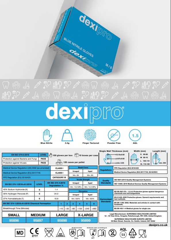 DexiPro Disposable Powder-Free Nitrile Medical Gloves offer reliable protection and comfort. They feature a vibrant blue color and are designed for single-use applications in medical, laboratory, and food-related environments.