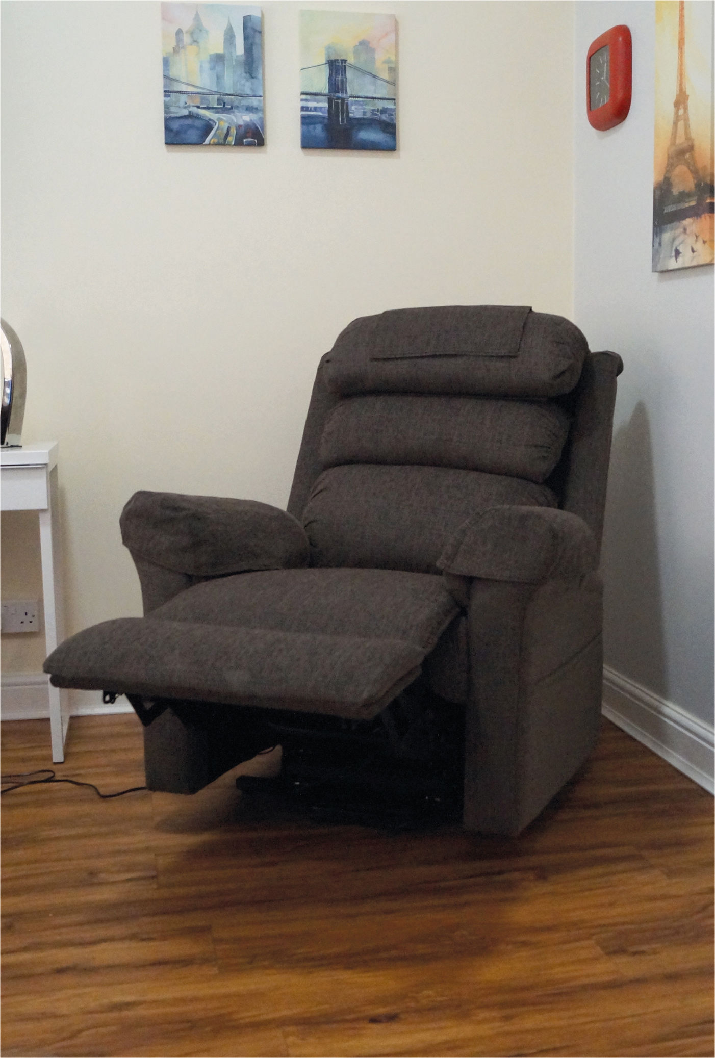 The Ecclesfield Wall-Hugging Rise and Recliner Chair, upholstered in stylish chenille fabric, is a perfect addition to any living room. Designed for both comfort and functionality, it features lift and recline capabilities, a waterfall pillow back design, and a high-quality OKIN single motor drive system. The chair includes convenient features such as detachable arm and headrest covers for easy cleaning, side pockets for remote controls and magazines, castors for effortless mobility, and an intuitive 2-button handset. Its wall-hugging design requires just a 4-inch clearance from the wall, making it ideal for smaller spaces. The Ecclesfield Chair can be split for easy transportation and supports users up to 160kg. Fully certified to British Standards, it combines style, safety, and practicality for enhanced independent living.