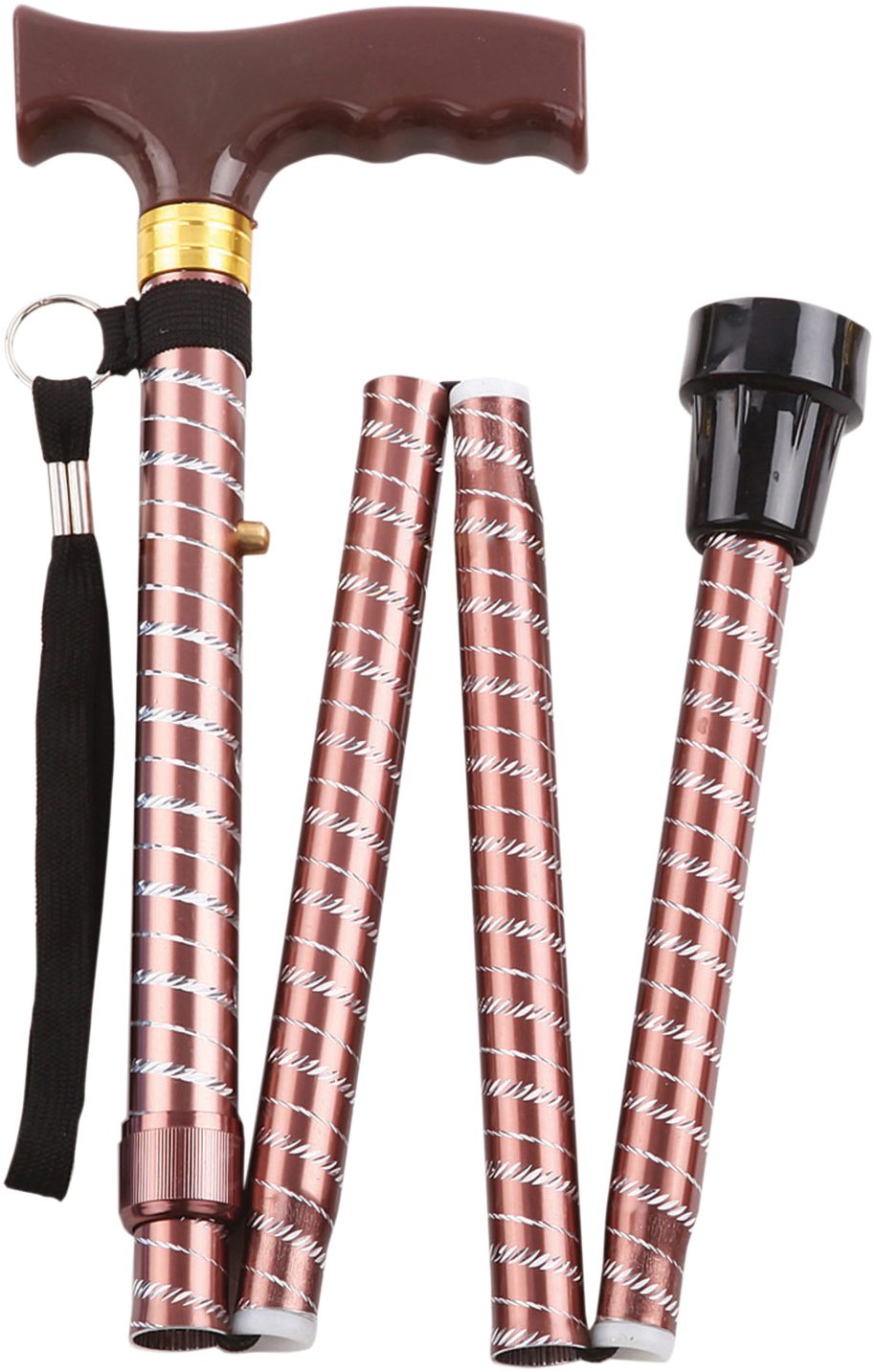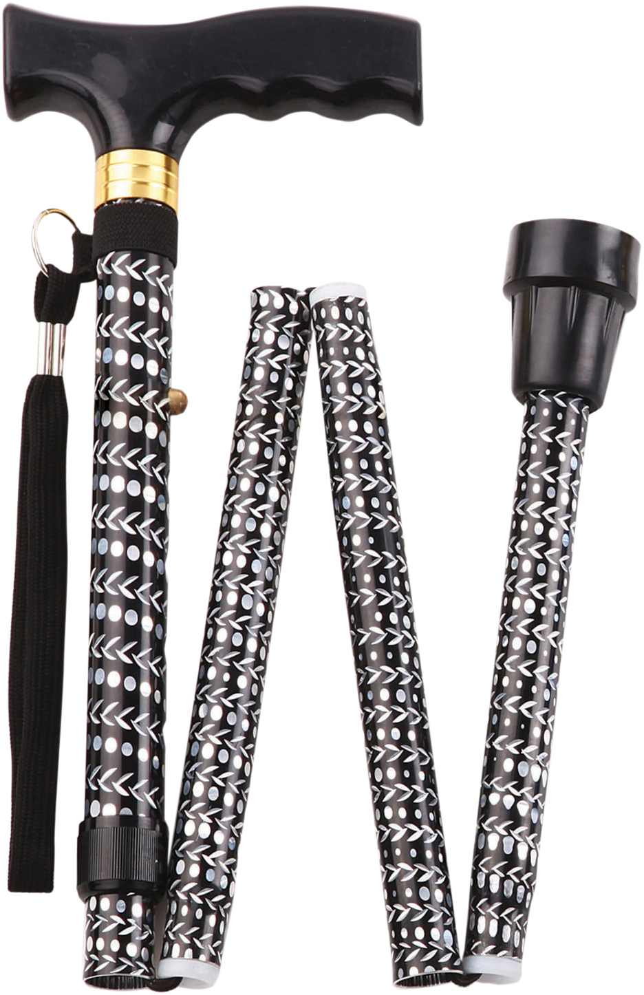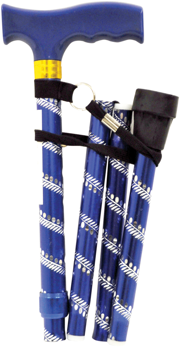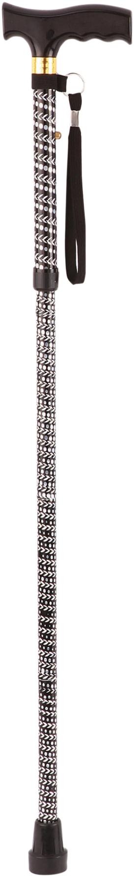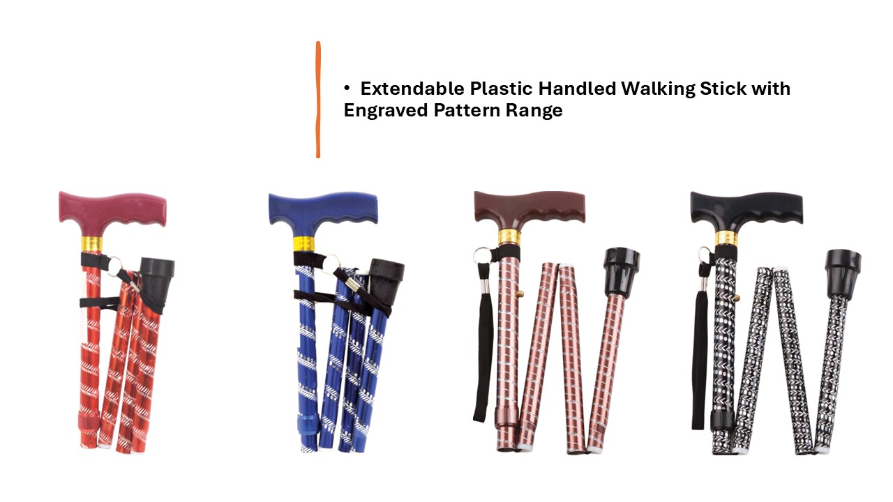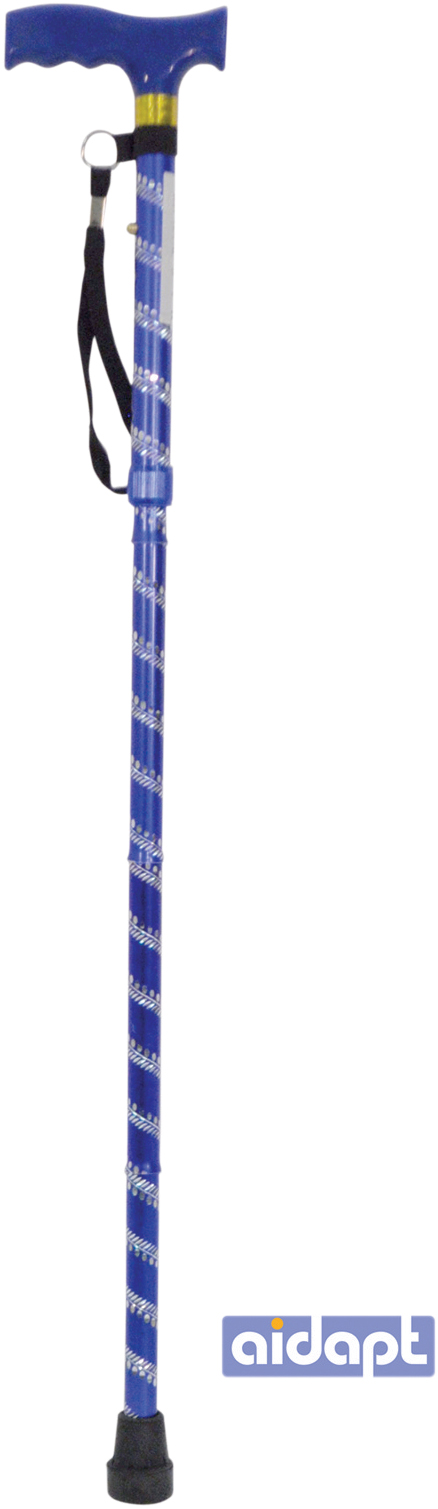 An extendable, plastic handled walking stick with 5 foldable sections and 5 height adjustment settings for use with either hand. Featuring an attractive, decorative engraved pattern and available in several colours and designs.