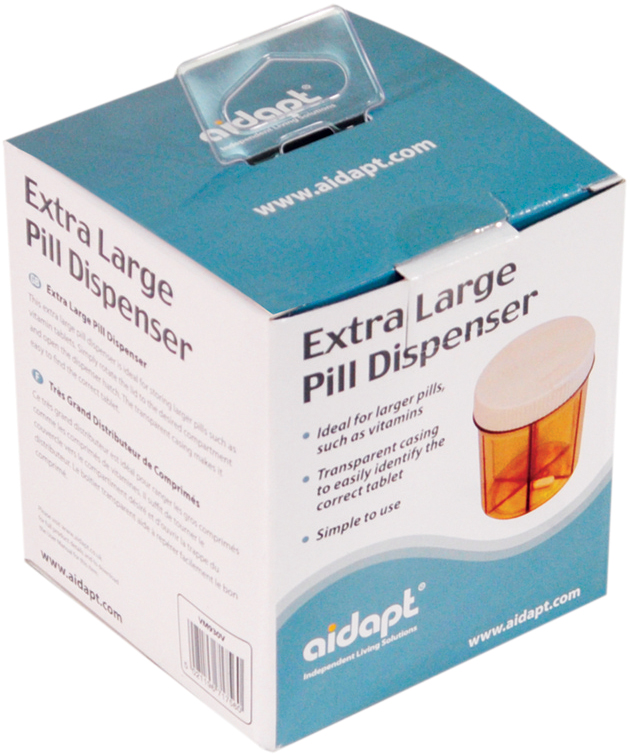 This extra large pill dispenser is ideal for storing larger pills such as vitamin tablets. Simply rotate the lid to the desired compartment and open the dispenser hatch. The transparent casing makes it easy to find the correct tablet.