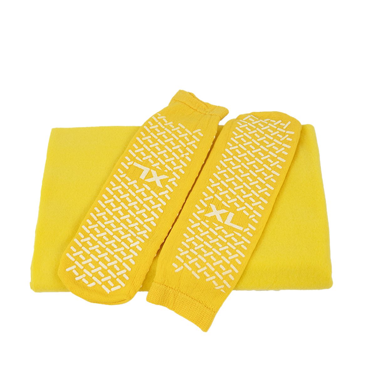 The yellow non-slip socks in the kit are size XL, which is equivalent to UK adult shoe size 8-11. But, if the patient’s feet or ankles are swollen, we recommend buying larger fall prevention socks and matching them up with the yellow lap blankets as separate items to create your own kits. Therefore, to create your own kit, view the XL non-slip socks and the yellow fleece lap blankets.