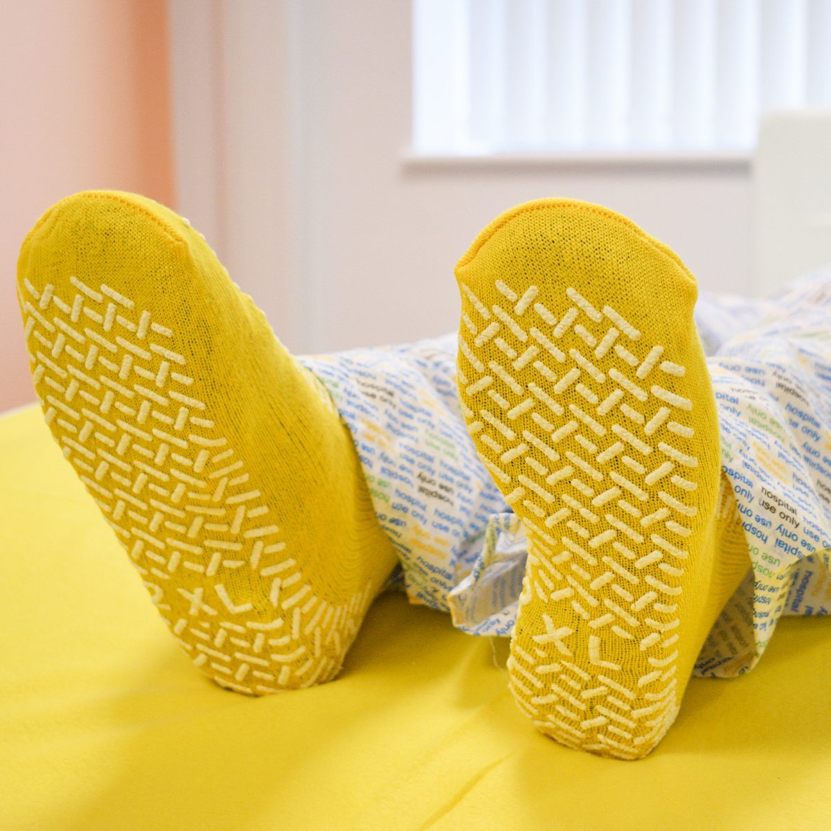 Improved patient safety: Gripped socks offer grip on smooth floors, while the fleece blanket adds warmth and comfort.