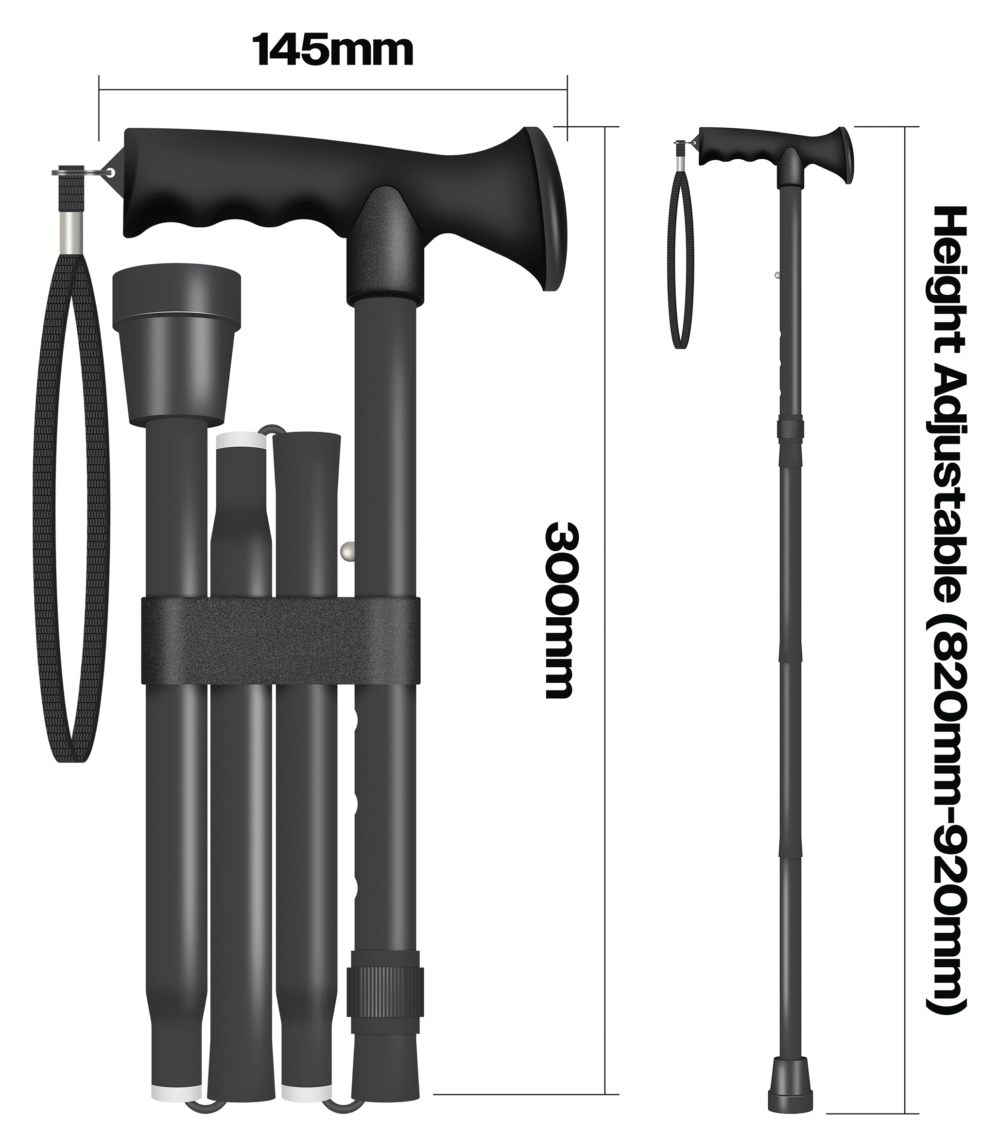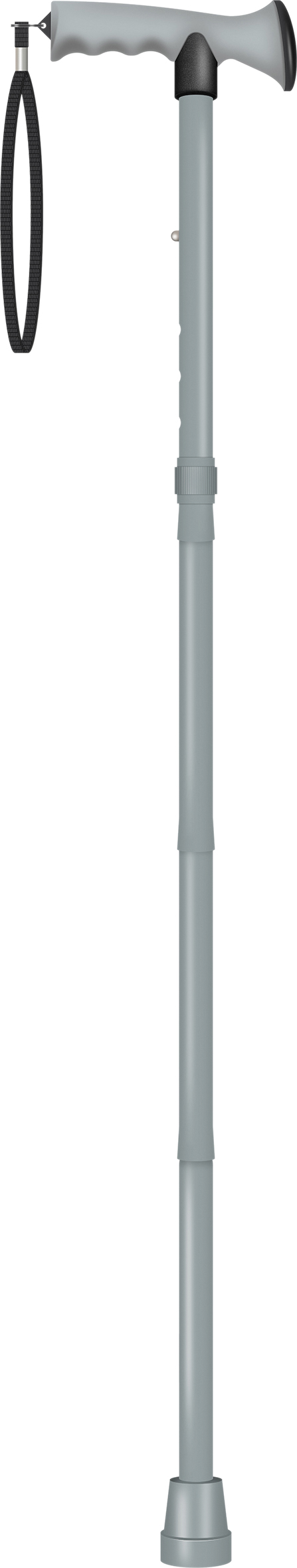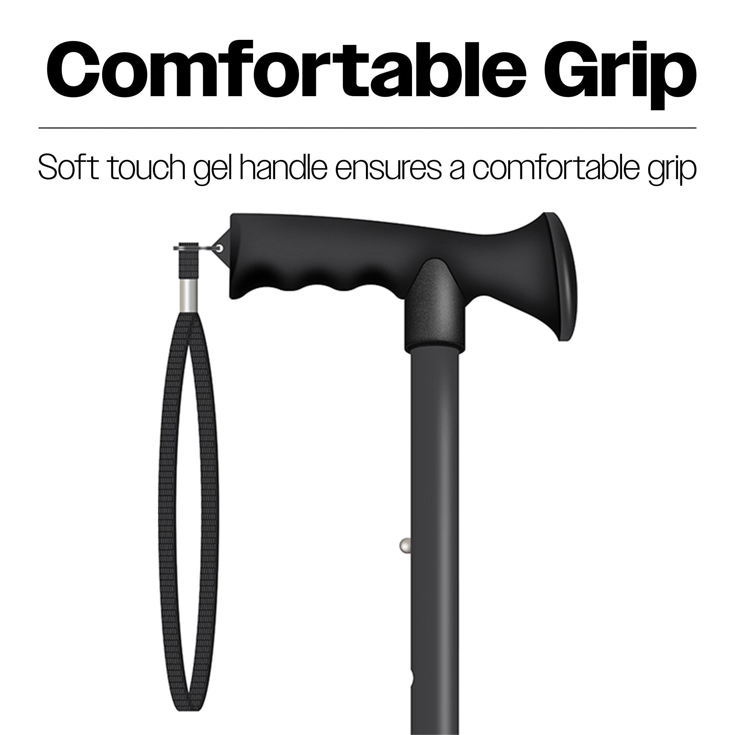 An adjustable rubber-handled walking stick featuring five height settings, suitable for use with either hand. The walking stick boasts a colorful design complemented by a black wrist strap, ensuring both style and security. Its foldable design allows for easy storage in a bag, pocket, or drawer, making it ideal for travel. Crafted from durable yet lightweight aluminium, it offers an ergonomic rubber handle for comfort and a soft rubber tip for added safety. Available in a variety of vibrant colours to suit all preferences. Maximum user weight capacity: 100kg.
