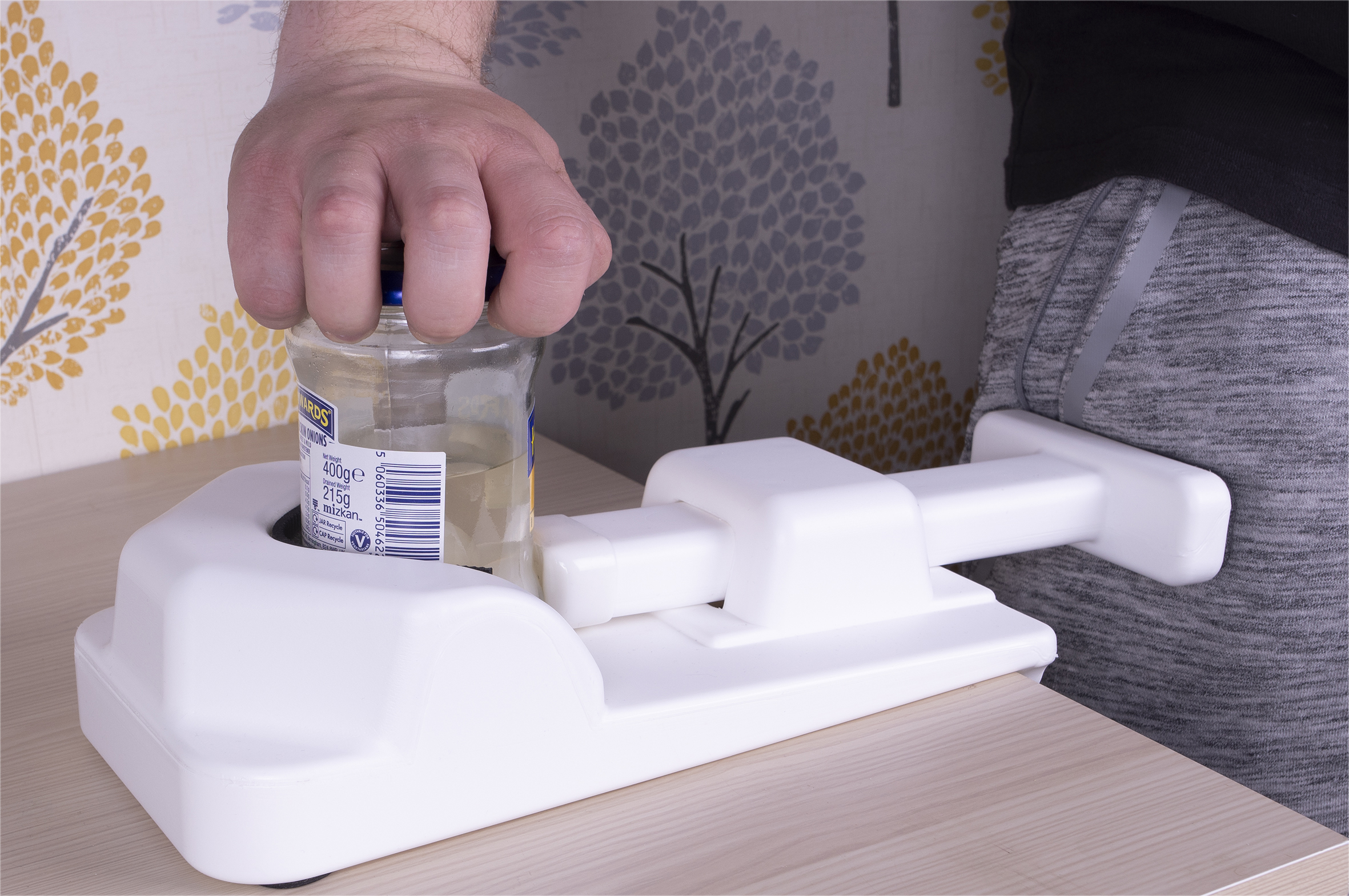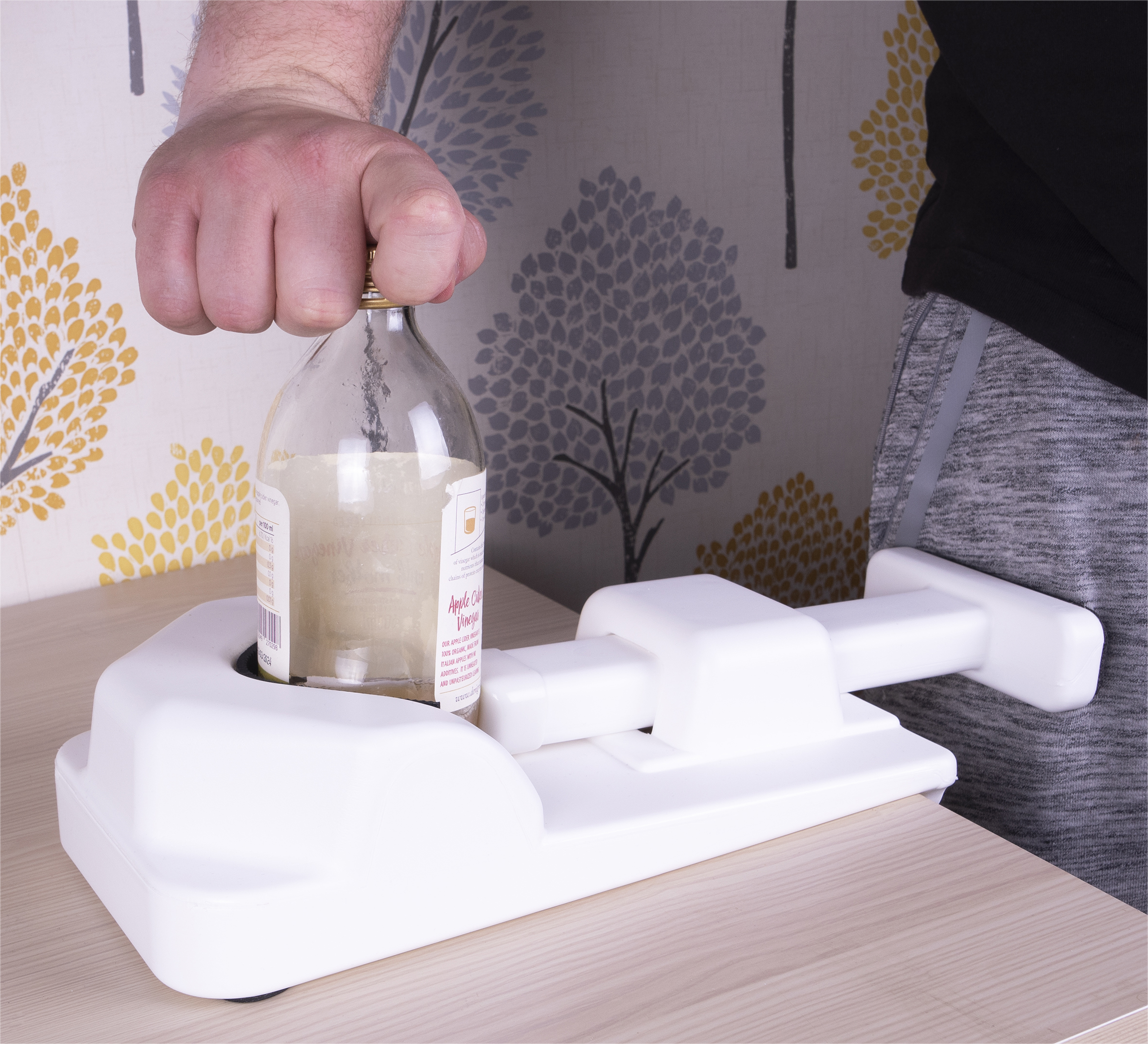 The jar and bottle holder enables the user to open caps easily and is ideal for those with limited dexterity and weakness in the arm or hands. The jar and bottle holder can also be used single-handed. It is dishwasher safe and features a padded push bar for comfort and non-slip strips for ease of use.