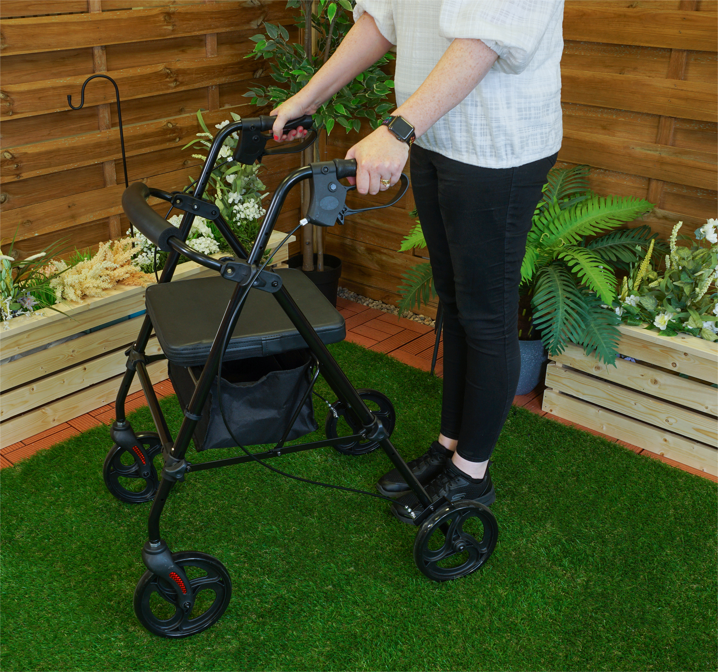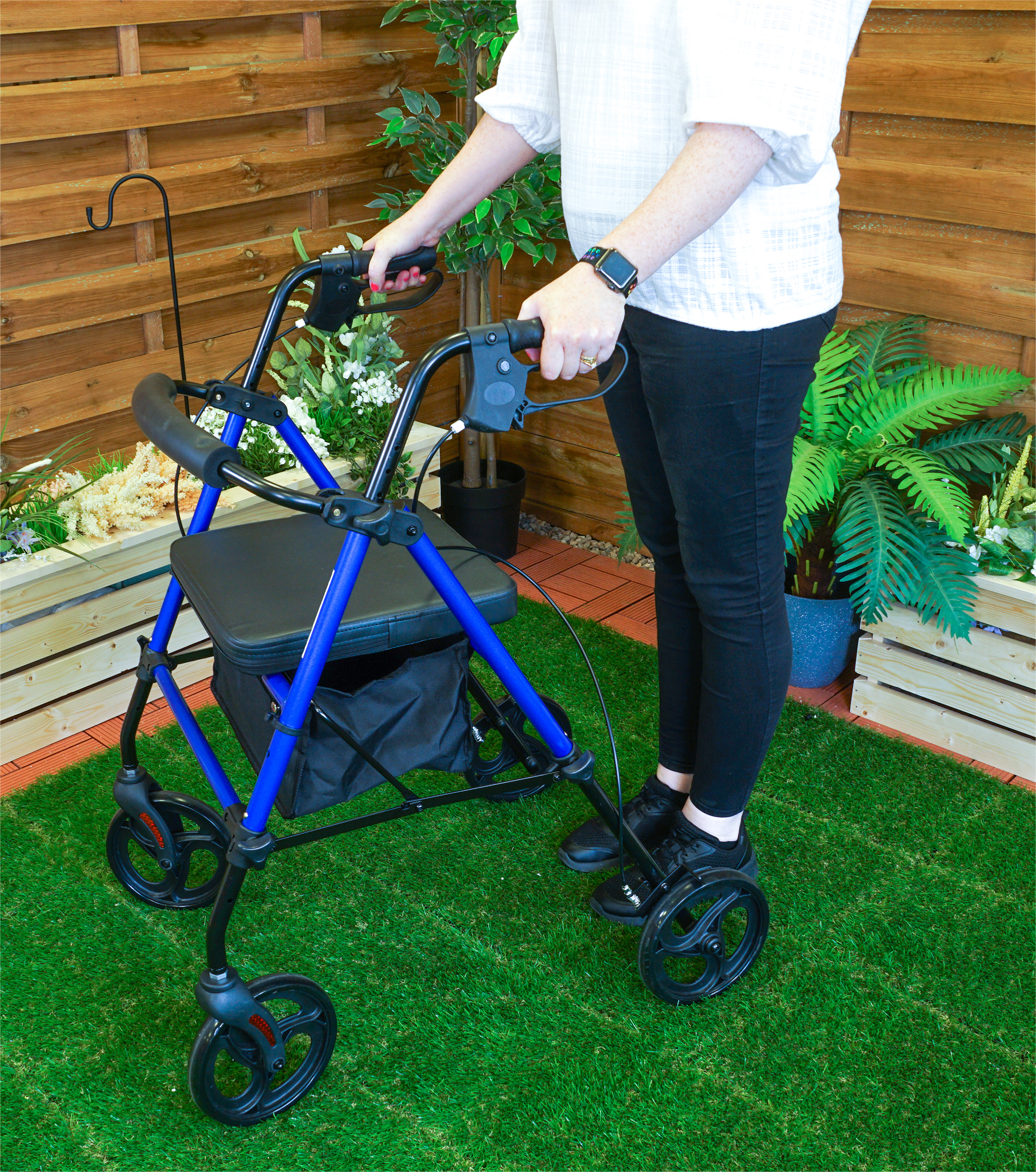 This lightweight yet durable rollator is crafted from a combination of steel and aluminium, featuring 8-inch solid puncture-proof wheels for reliable outdoor and indoor use. It has height-adjustable ergonomic handles with push-down brakes that lock into a stationary position, making it especially suitable for users with limited grip strength. Height adjustments are made easily using arthritis-friendly thumbwheel fixings, while the legs can also be adjusted via a simple push pin mechanism for a customized fit.