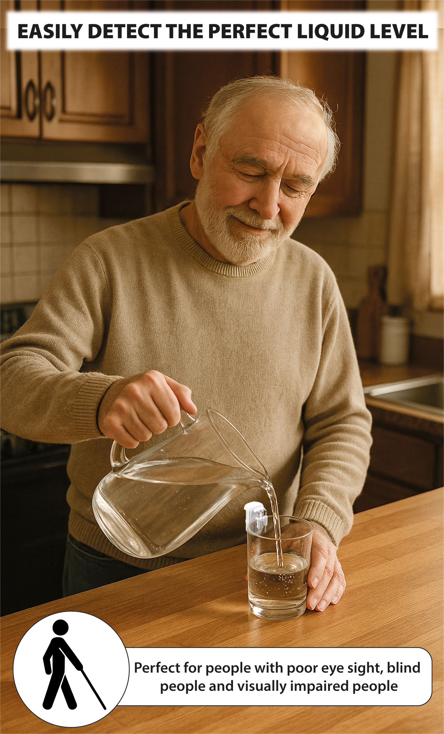 The Liquid Level Indicator is a practical and reliable assistive device designed to help visually impaired individuals safely prepare hot and cold drinks such as tea, coffee, or squash. Compact and simple to operate, it securely clips onto the edge of a cup, mug, or glass. When activated, it uses sound and vibration alerts to notify the user as the liquid reaches a pre-set level.