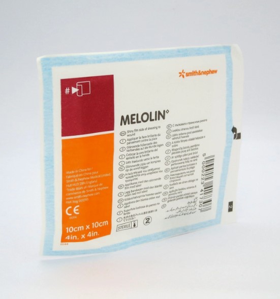 Melolin Dressing consists of three different layers, including low adherent perforated film, a highly absorbent cotton/polyester pad and a hydrophobic backing layer.