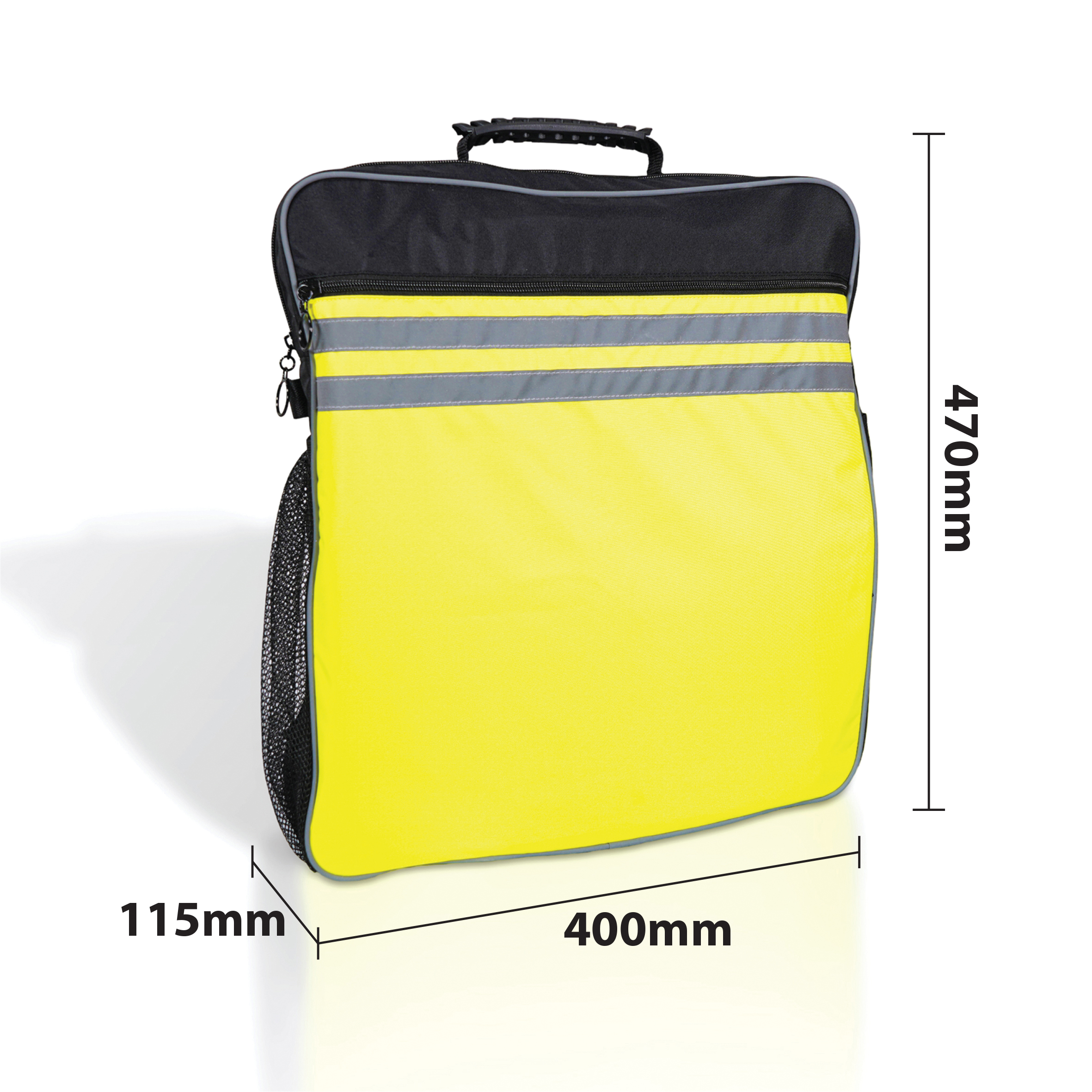 This Scooter Bag has been specially designed to provide high visibility when you are out in darkness and low light conditions. It fits neatly onto the rear of most standard electric scooters and provides storage for coats or jackets, shopping, medication, snacks, etc. There is a generously sized main pouch and a further front pouch for paperwork and smaller items. Both have zip fastening to keep your items secure. The zip fasteners have large size pulls for those with arthritis or for people wearing gloves.