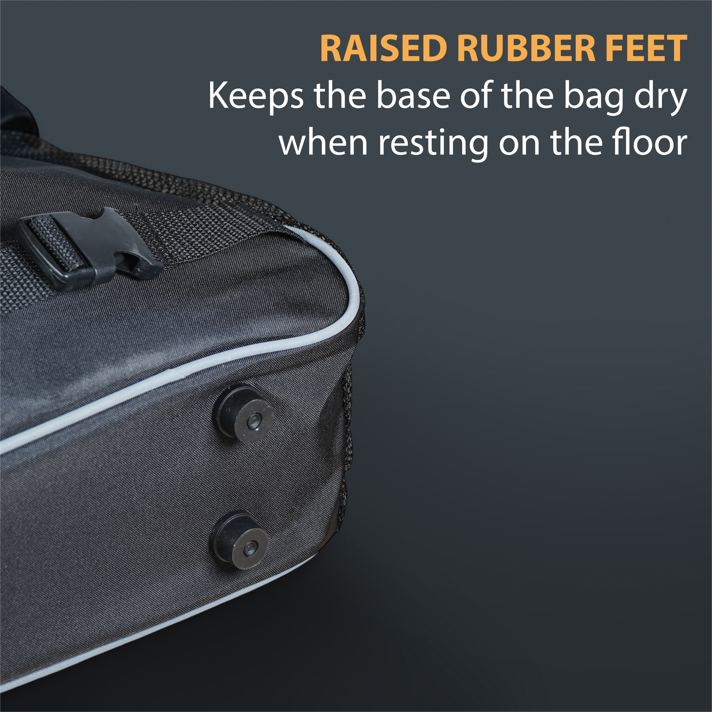 FEATURES: Equipped with a sturdy carry handle and raised rubber feet to prevent the bag from getting wet when placed on the ground. The large zipper pulls are arthritis-friendly for easy opening and closing.