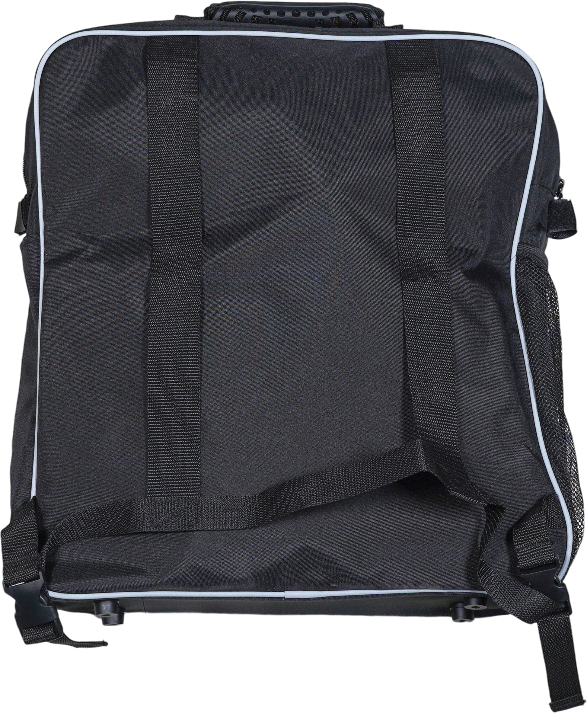 There are two side pockets; a mesh fabric pouch is used for storing umbrellas or drinks bottles and the second side pocket is used for storing a walking stick or crutch. There is a hook and loop fastener that will keep your walking aid in place. The Scooter Bag is a practical and affordable scooter accessory that enables scooter users to safely carry more, while keeping their hands free. It is water resistant and features raised rubber feet on the base to keep the bottom of the bag dry when it is resting on the floor. There is a sturdy carry handle on the top of the bag and adjustable straps with buckles for secure fastening on the rear.