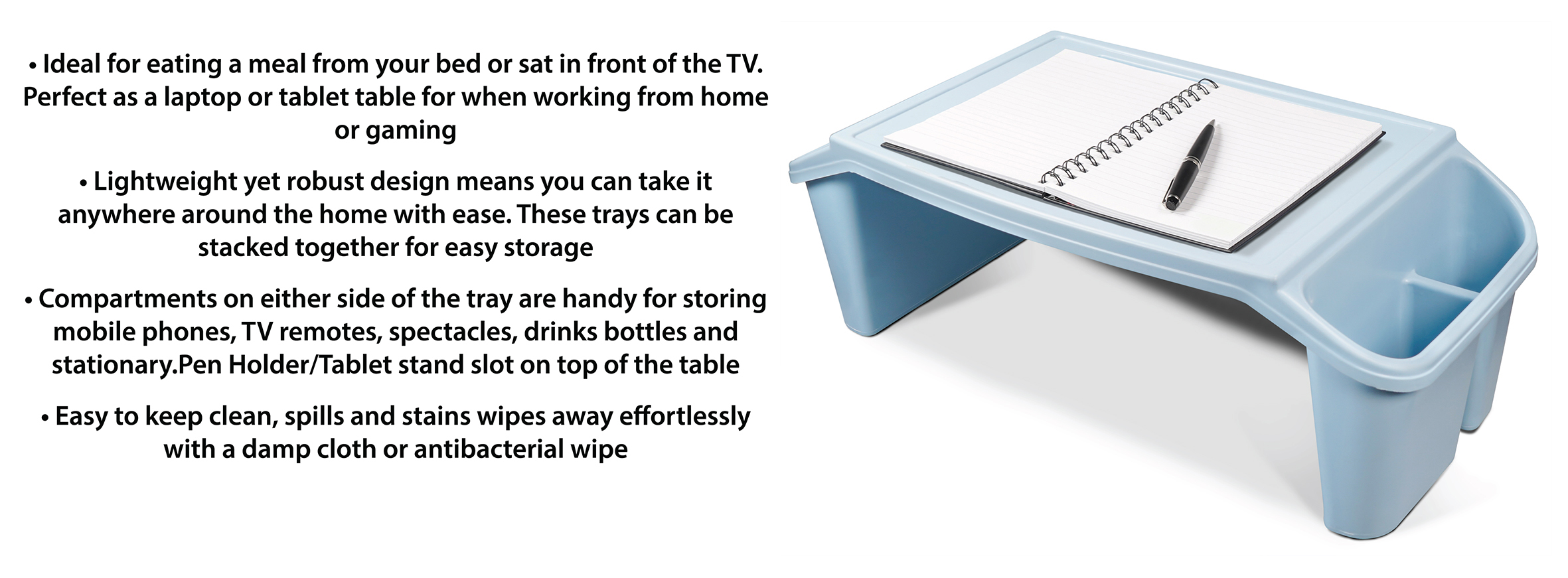 These versatile all-purpose tray tables are crafted from durable plastic and designed to comfortably fit over your legs whether you’re lying in bed or sitting on a sofa or chair. They are perfect for working on a laptop, reading, doing crafts, or enjoying breakfast in bed. Each table features side storage compartments on both ends, ideal for holding drink bottles, stationery, remote controls, reading glasses, phones, and more. They are especially great for children to draw and colour. The table top includes a convenient cut-out slot to securely hold a tablet or phone upright. Lightweight and stackable when purchased in multiples, these tables are easy to store. Plus, their smooth surface can be effortlessly wiped clean, ensuring hygiene and convenience.