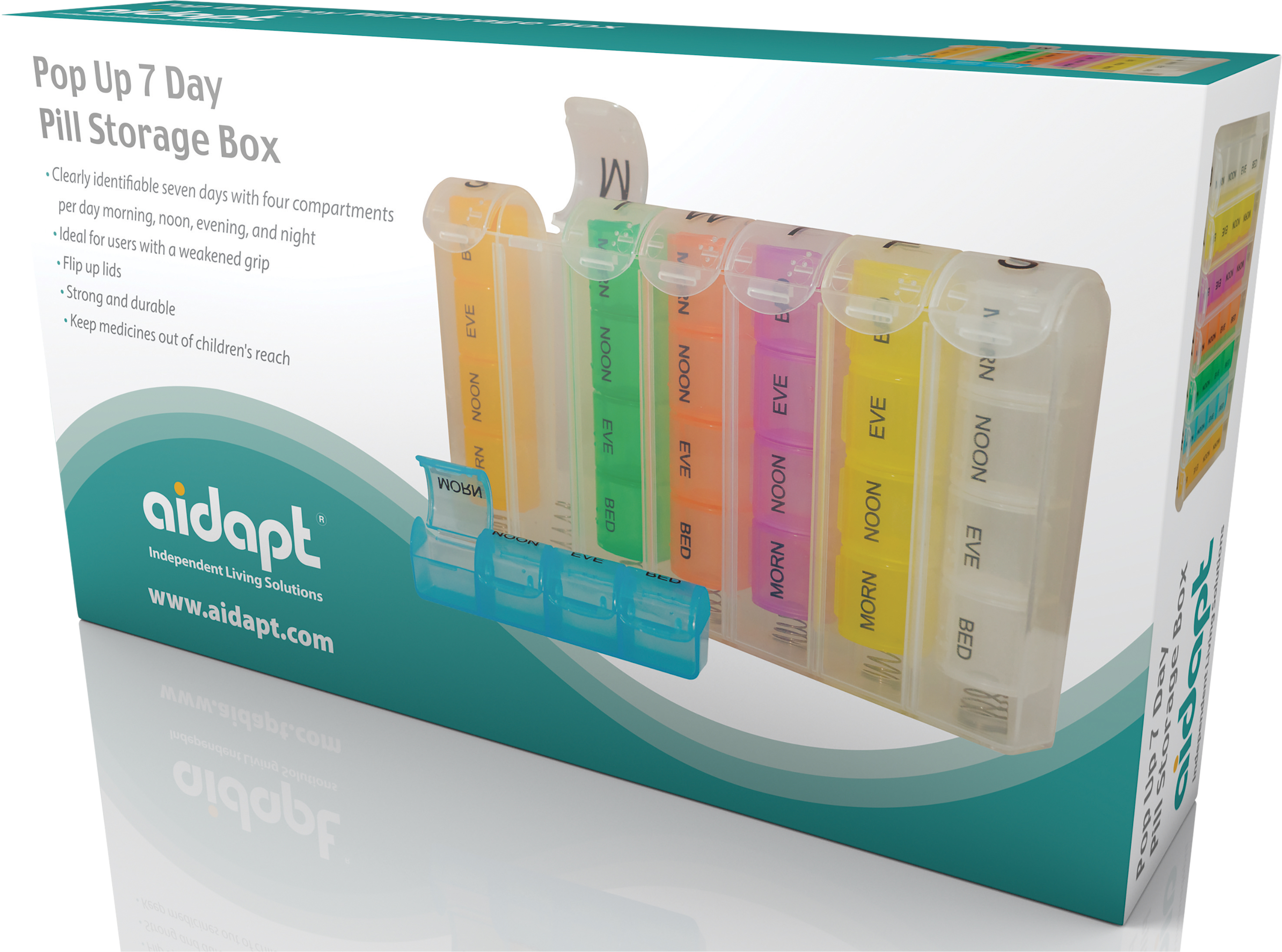 This deluxe pop up pill dispenser is the perfect way to make sure you never miss your medication. Each pill holder is sat on a spring that pushes each compartment up when the user opens the lid making it easy for people with a weakened grip. There is a holder for each day of the week and four separate compartments for morning, noon, evening and bedtime. Ideal for use in the home or on holiday. Always ensure you keep medicines out of children s reach.