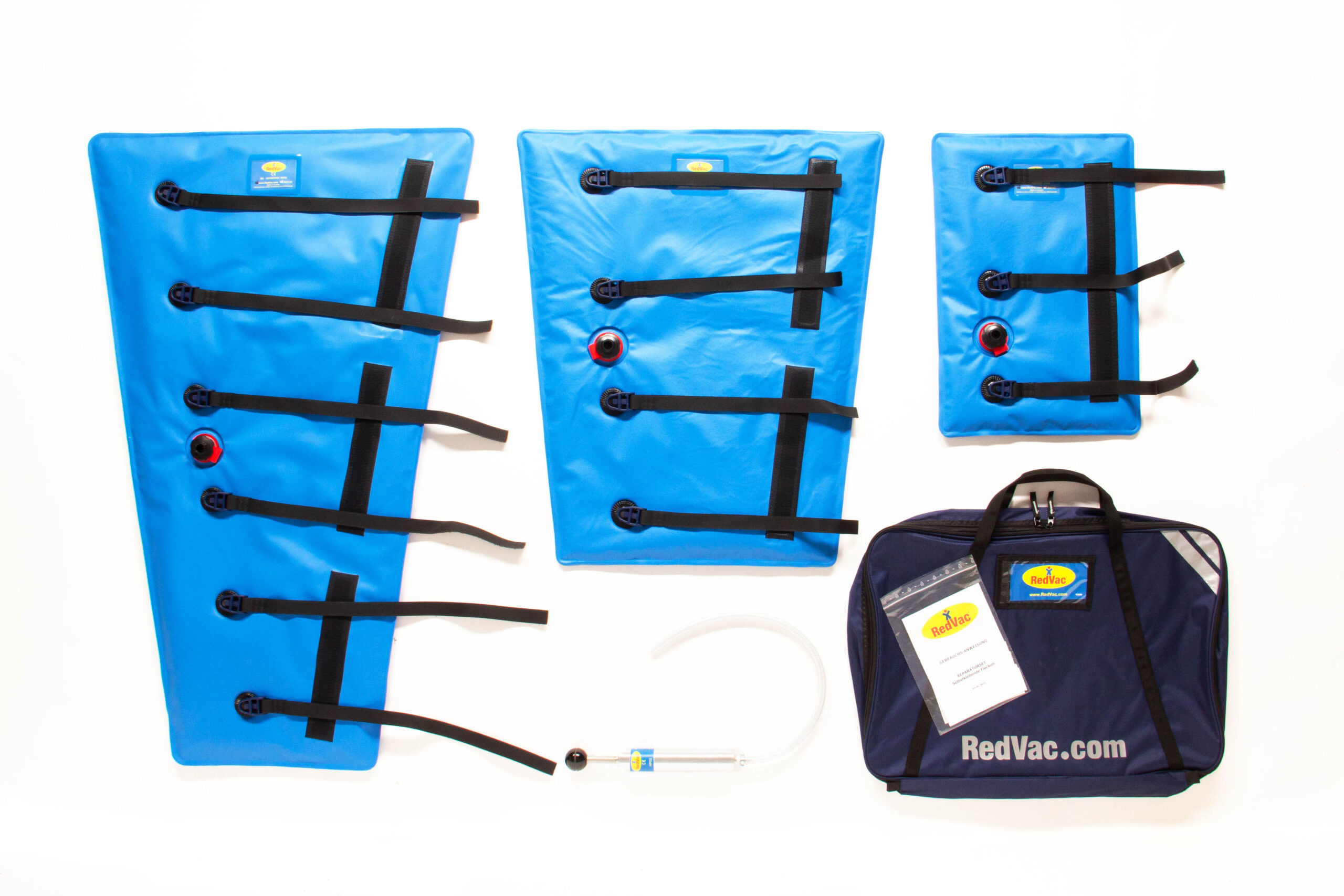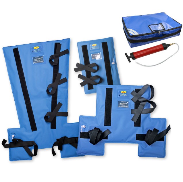 The RedVac EMS Vacuum Splint Set includes three specialized splints (Ankle/Foot, Lower Limb, and Arm), a pump, and a convenient carry bag—ensuring your equipment is organized and ready when needed.