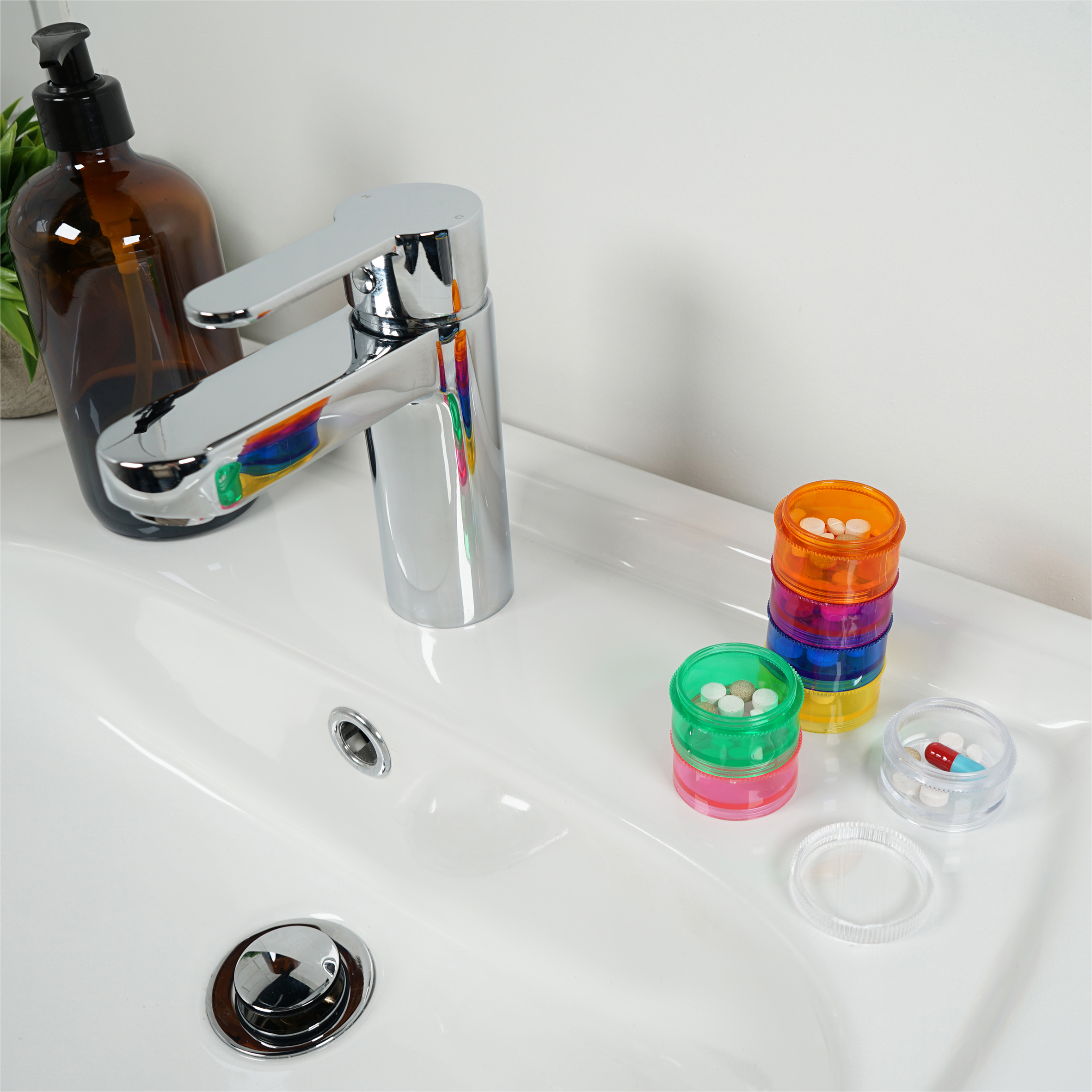 Introducing the ultimate portable medication organizer: the seven-compartment stackable pill box. Designed for convenience, each compartment screws securely into a compact tower that fits easily into your handbag or purse. Its vibrant, colorful exterior adds a lively touch, while transparent lids allow you to quickly see your pill contents at a glance. Capable of holding a week’s supply of medication, this sturdy, well-crafted pill box is an ideal travel companion, helping you stay on top of your medication routine wherever life takes you.