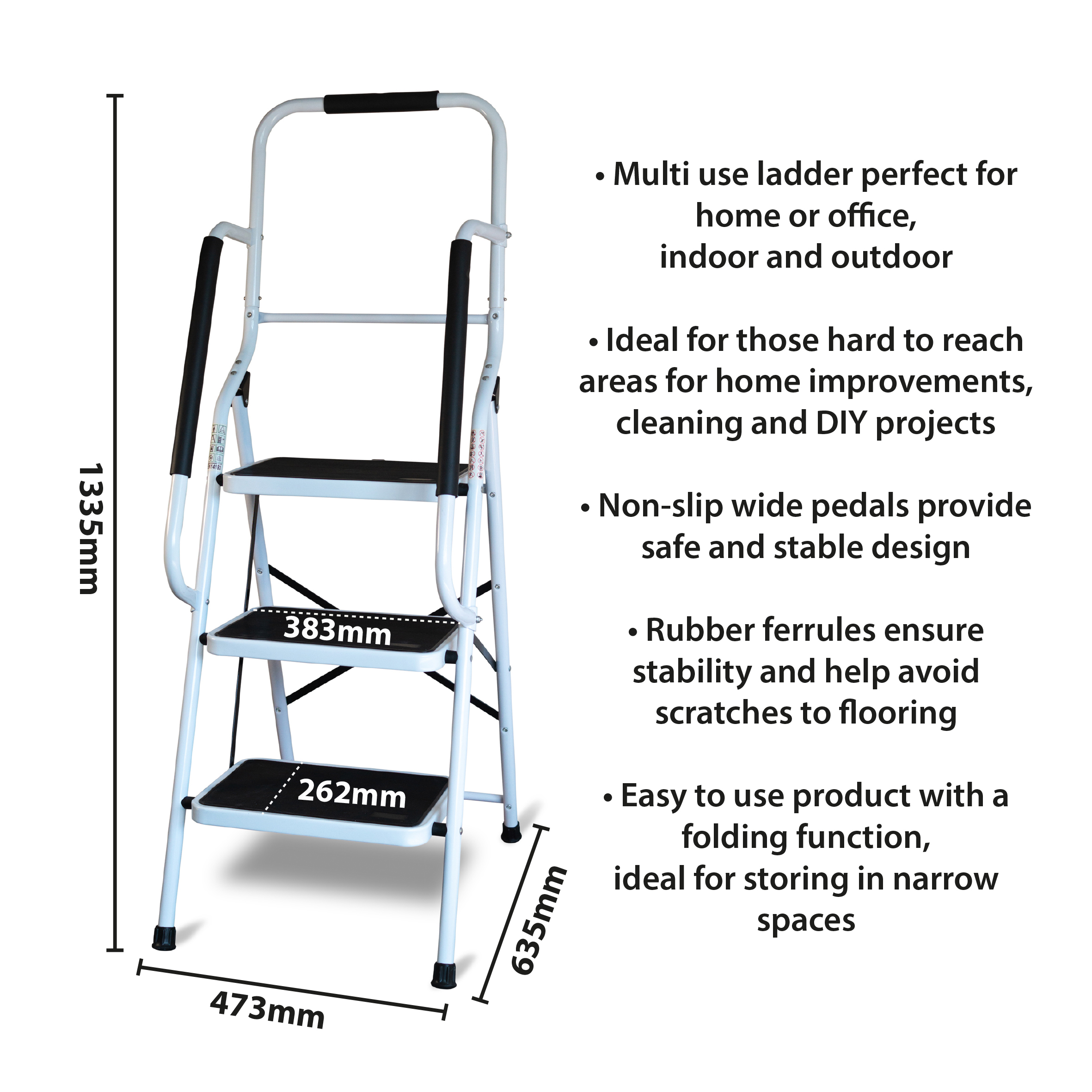 The Step Stool with handrail is a versatile step that can be used indoor or outdoor, ideal for cleaning, conducting home renovations, DIY jobs and reaching those hard-to-reach places. The folding design allows for easy storage and can fit into narrow places. The lightweight and close-packed design provide easy transportation in use. This step ladder features a safe and sturdy design. The non-slip wide pedals allow users to feel balanced, and the rubber ferrules protect your floor from scratching and further reduce the chance of slipping. The rubber handrail feature allows for additional grip. Item available as a 2 or 3 step model.