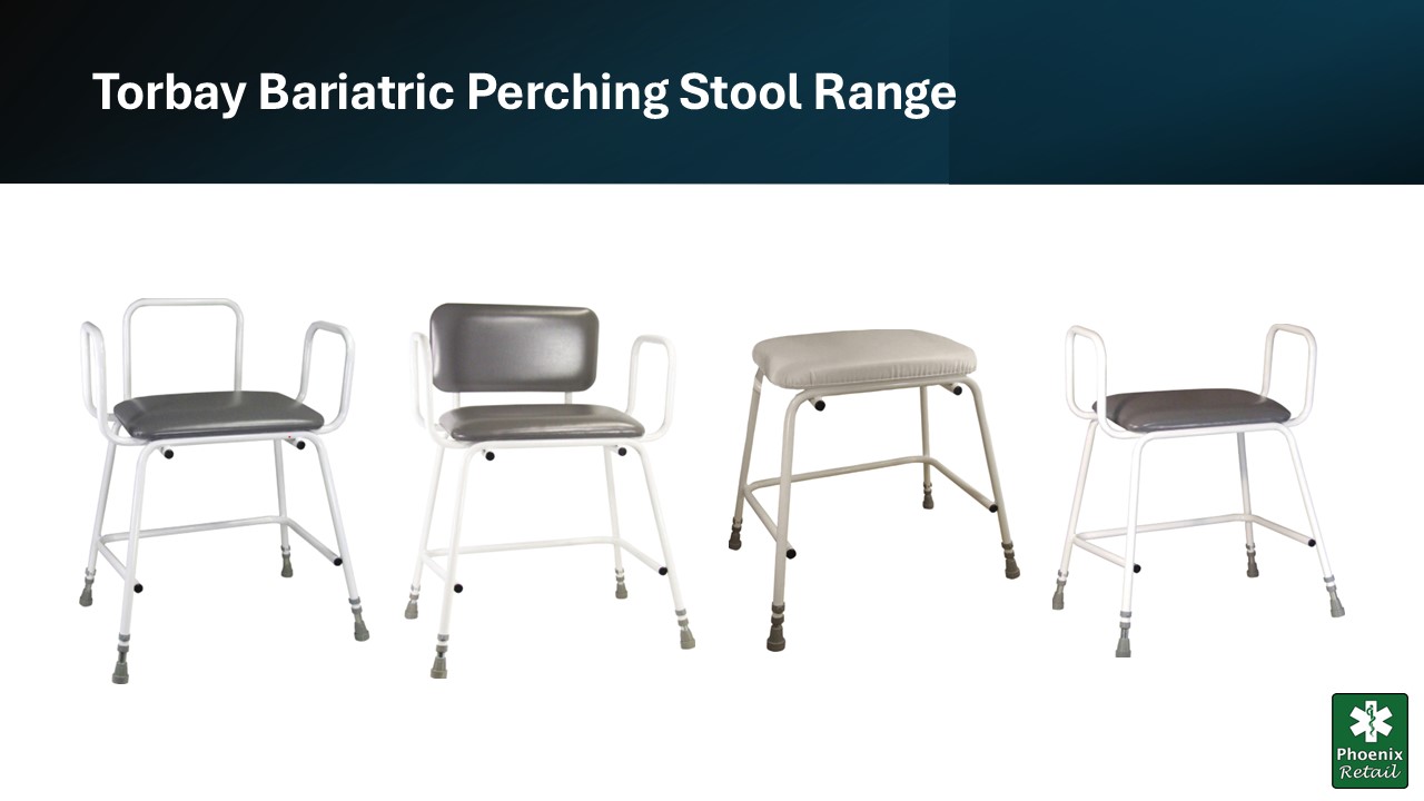 The Torbay Bariatric Perching Stools are specially designed to meet the needs of bariatric users. Key features include adjustable height, a wide seat frame, and a reduced incline to enhance comfort and safety. The stools also have a large footprint for improved stability and a V-shaped front brace for added strength and safety. The Torbay Bariatric Perching Stool range offers a variety of options to suit different requirements, including models with or without arms and with plain or padded backs, making it a comprehensive solution for bariatric support.