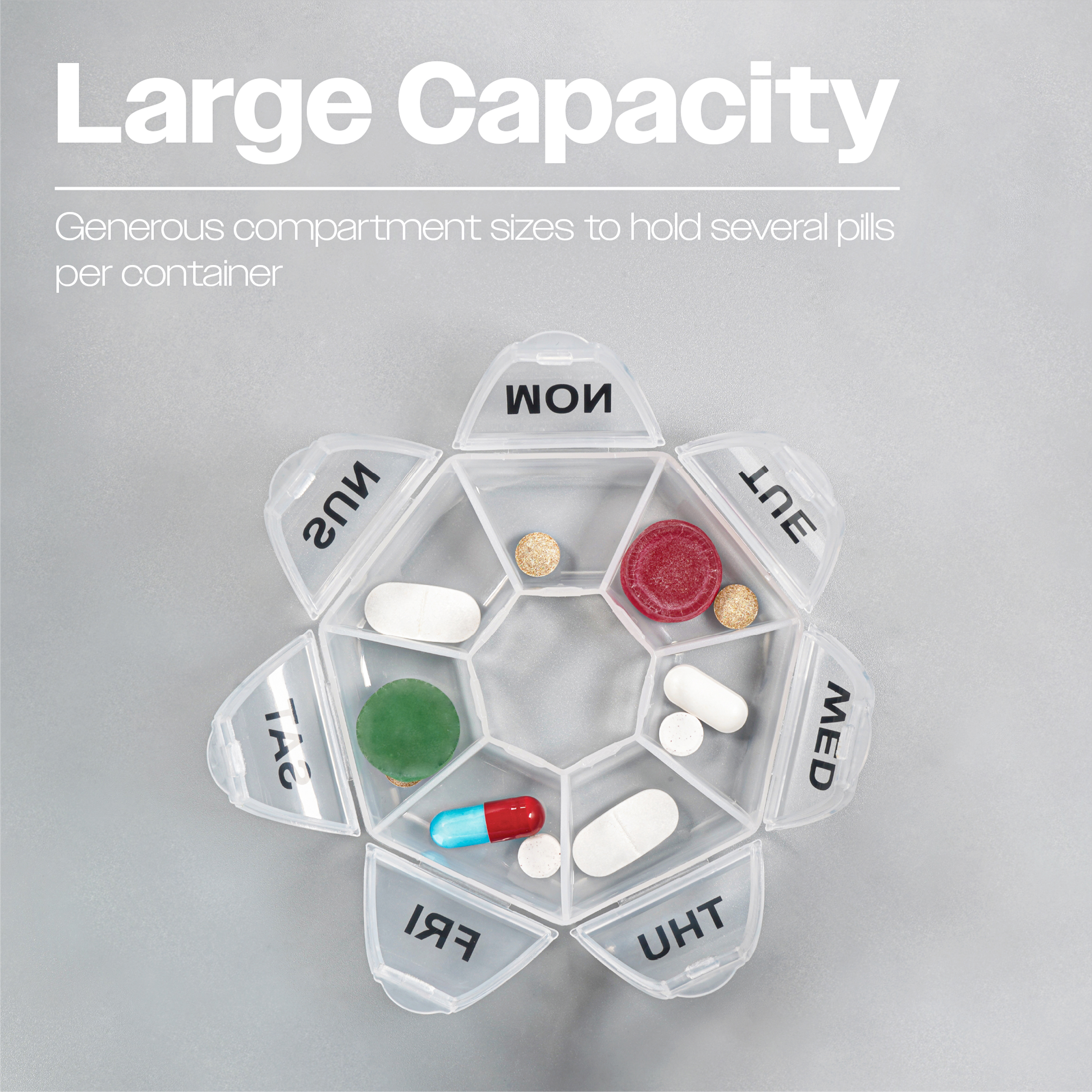 - LARGE CAPACITY; Generous compartment sizes. Will hold several pills per container
